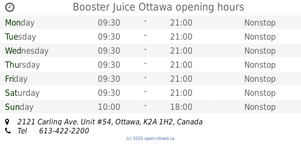 It is also possible to : Edit these OPENING HOURS of Restaurant Booster Juice In Ottawa, 2121 Carling Ave. Unit #54,